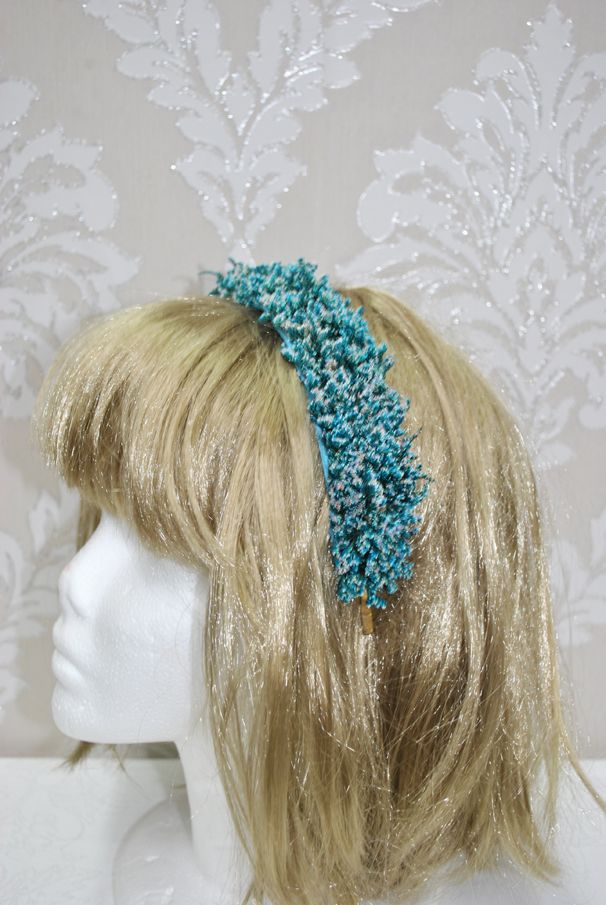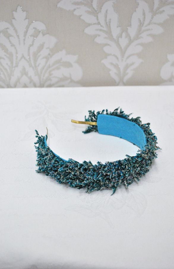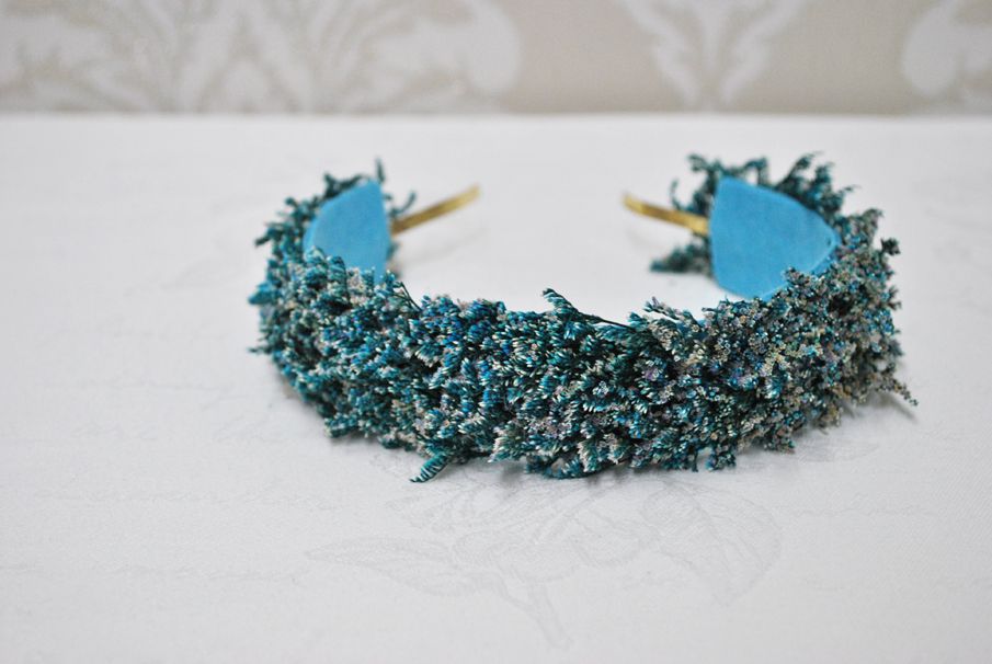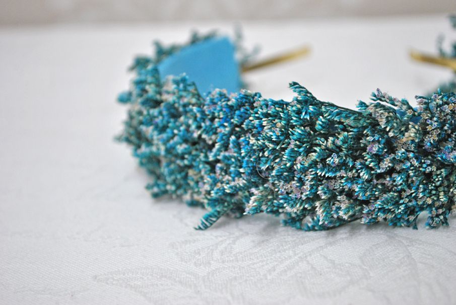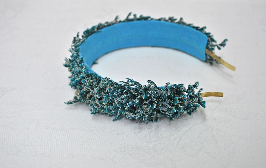 Preciosa diadema o tocado de fiesta hecho a mano. Se trata de una diadema de metal dorada decorada a base de pequeñas espigas de trigo preservadas en un atractivo color azul. Ideal para completar tu look y que luzcas como la invitada perfecta.