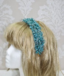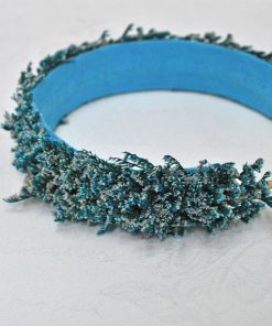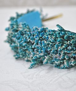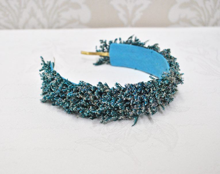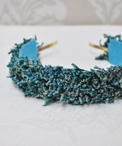 R02/4603 – Preciosa diadema o tocado de fiesta hecho a mano. Se trata de una diadema de metal dorada decorada a base de pequeñas espigas de trigo preservadas en un atractivo color azul. Ideal para completar tu look y que luzcas como la invitada perfecta.