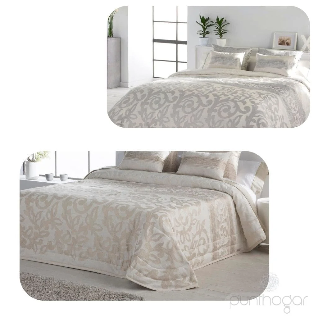 Alta confección y diseño muy elegante el de este edredón bouti con acolchado fino de 120grs. Lleva una cinta ribete en todo el contorno de la prenda. Su tejido jacquard presenta un sofisticado diseño ornamental con motivos florales de estilo damasco, lo que le confiere un aire atemporal y versátil. Dicho diseño destaca sobre un fondo liso, creando un contraste visual muy atractivo. Los colores suaves y delicados aportan una sensación de calma y tranquilidad al dormitorio.