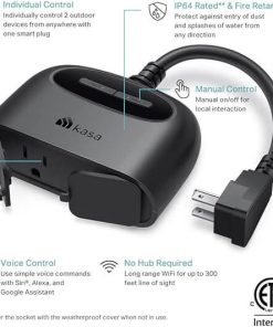 - Resistente a la intemperie: la clasificación IP64 de Kasa Smart Outdoor Plug garantiza que su dispositivo estará protegido contra la entrada de polvo y salpicaduras de agua desde cualquier dirección. Cuando no esté en uso, los enchufes deben permanecer tapados con la cubierta impermeable incluida.