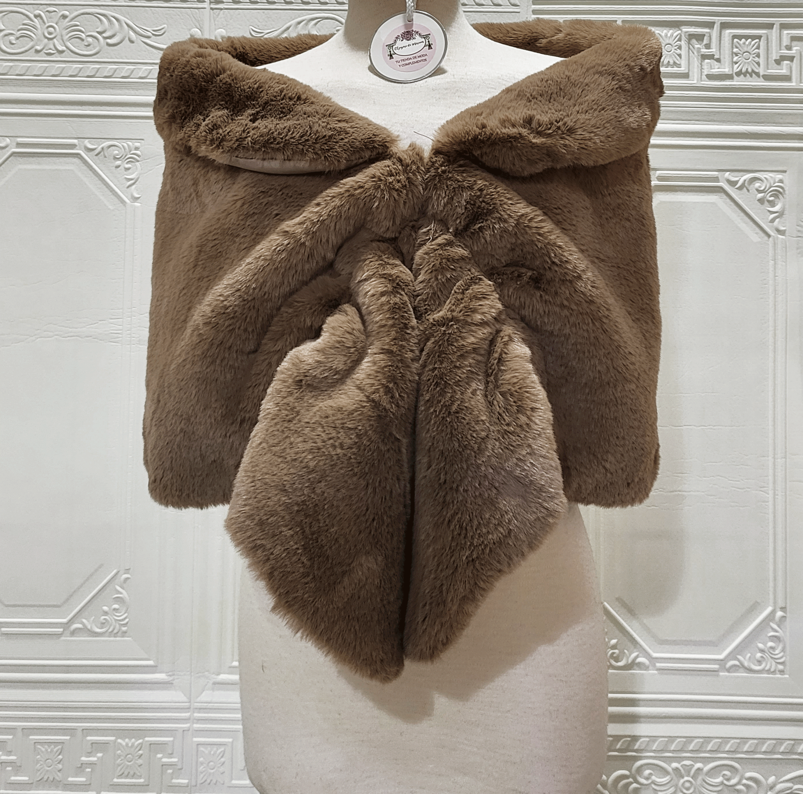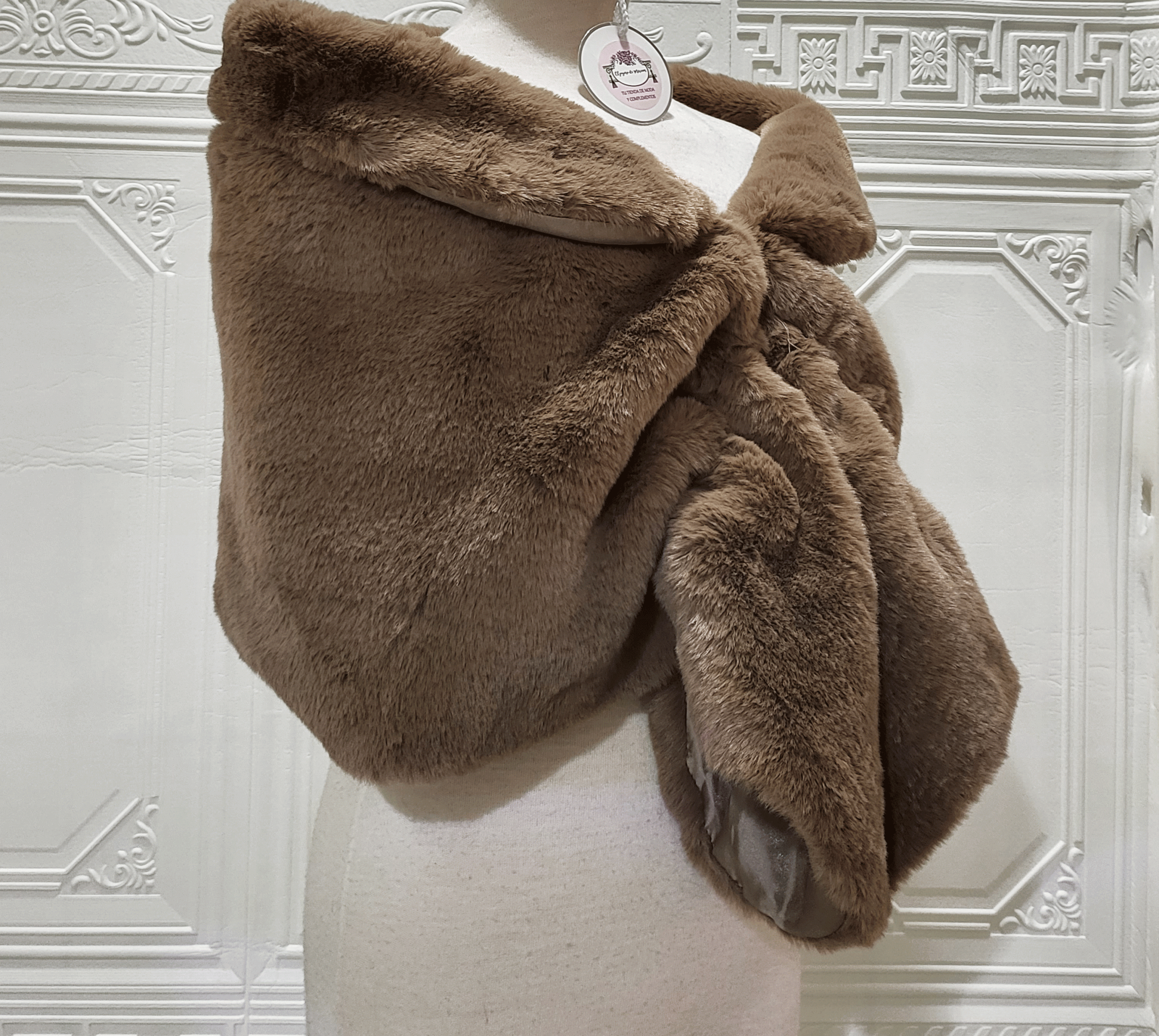R03/5400 – Capa o estola de fiesta, ideal para bodas y eventos especiales, fabricada en pelo sintético de un precioso y llamativo color MARRÓN. La estola consta del interior forrado, muy favorecedora y cómoda de llevar.
