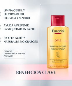 El Aceite de Ducha pH5 Eucerin de uso diario preserva las defensas naturales de la piel y previene su sequedad, incluso después de la ducha. Su fórmula contiene una formulación única de buffer citrato pH5 y surfactantes extra suaves que protegen las enzimas propias de la piel. La reposición intensiva de los lípidos deja la piel con una sensación nutrida y sedosa. Está probado en pieles secas y sensibles. Ideal para utilizarse en zonas afectadas por alergias.