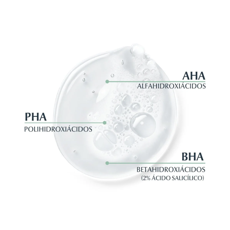 - Complejo de AHA/BHA/PHA: Una mezcla de alfahidroxiácidos (AHA), beta hidroxiácidos (BHA) y polihidroxiácidos (PHA) que exfolian suavemente la piel, eliminan las células muertas y reducen las manchas.