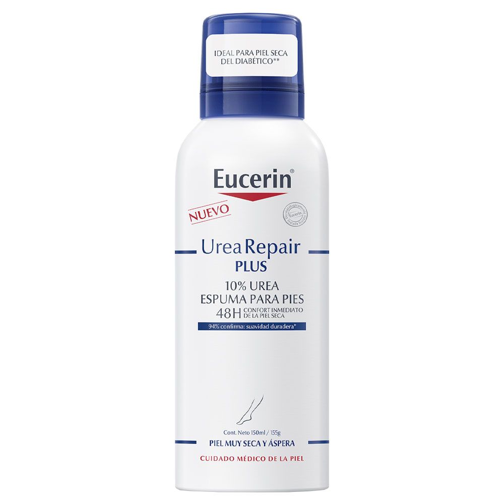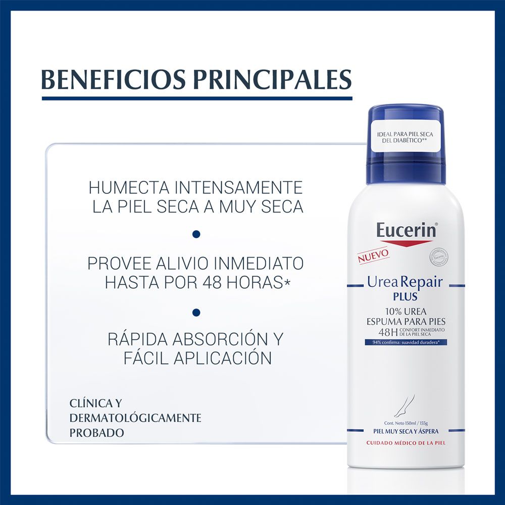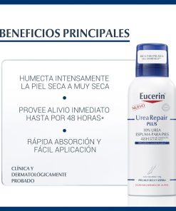 Eucerin UreaRepair PLUS Espuma para Pies 10% Urea trata la piel áspera y seca de los pies con una hidratación intensa que proporciona un alivio inmediato. Este producto de cuidado de los pies combina ingredientes clave para tratar la piel seca con una solución intensa y específica.