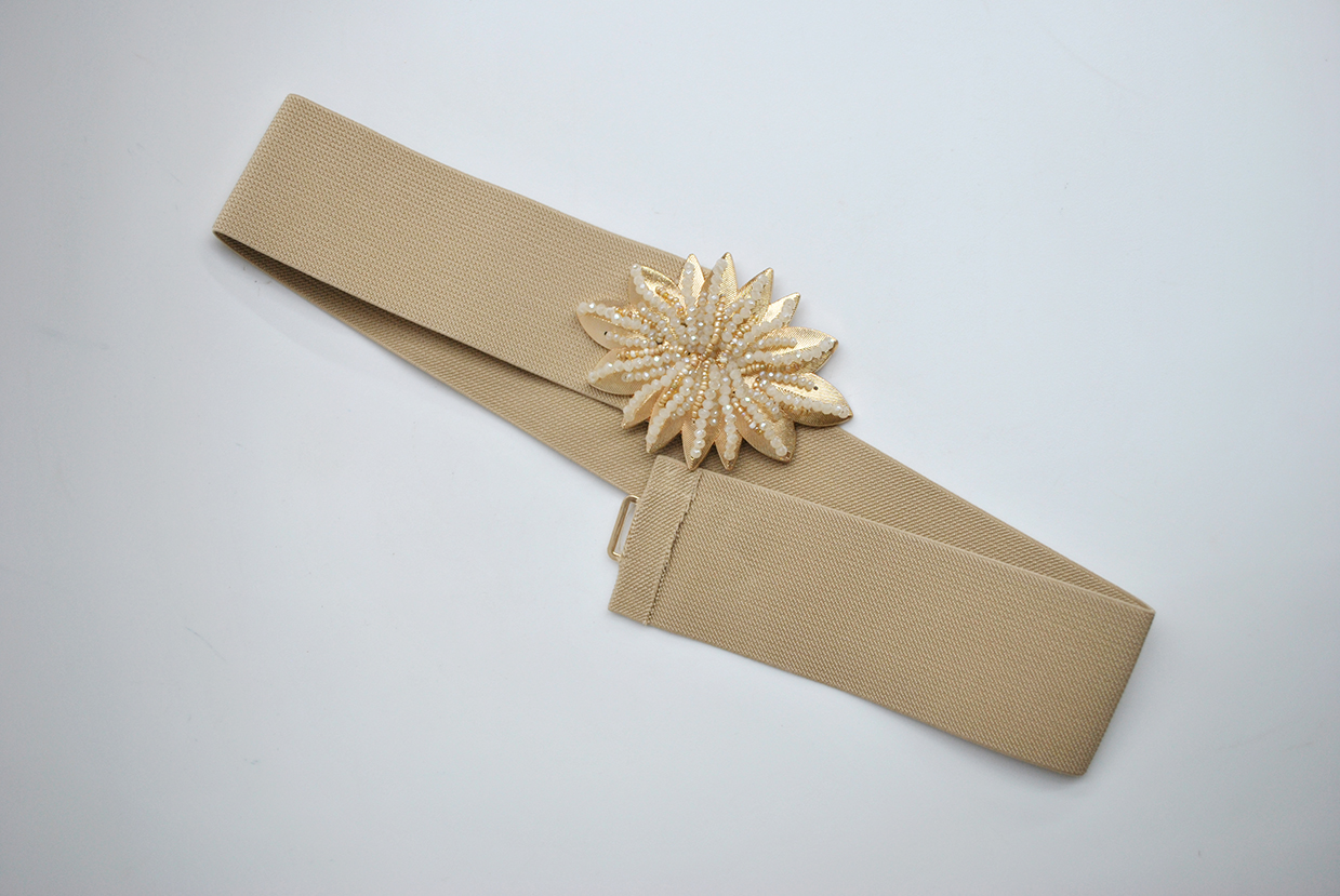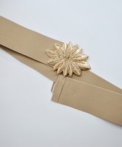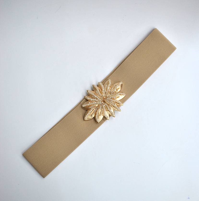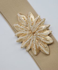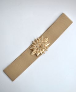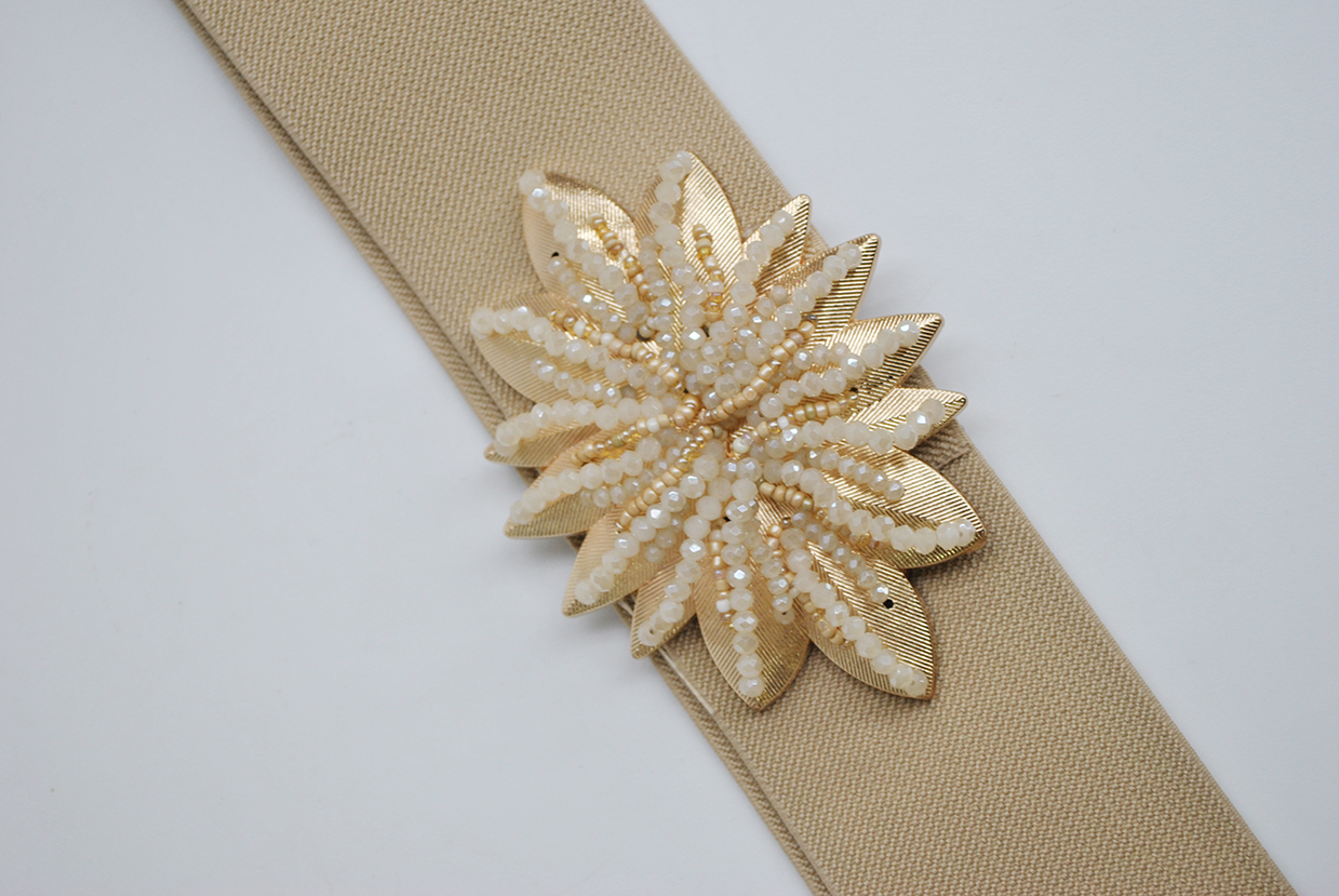 R03/5125 – Bonito cinturón ancho o fajín elástico para vestido. Se trata de un cinturón con la goma en color camel decorado con una hoja dorada metálica y cuentas cristalinas.