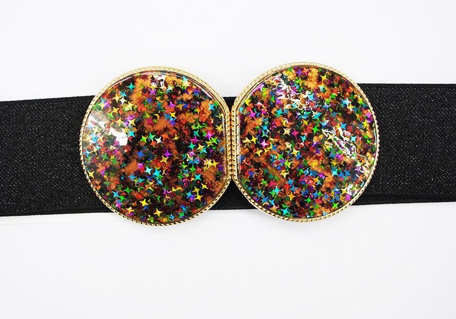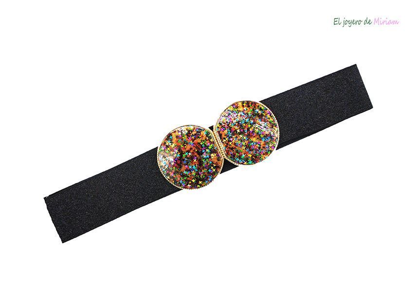 R20/3341 -Precioso cinturón de fiesta o fajín, perfecto para lucir con tu vestido de fiesta en bodas, comuniones y otras celebraciones, ideal madrinas e invitadas, Presenta la goma de la parte de la cintura negra brillante y elástica. Además, destacan dos medallones dorados en el centro decorados con estrellas multicolor.