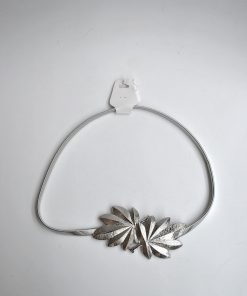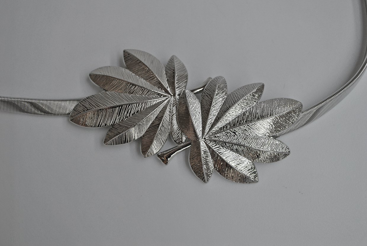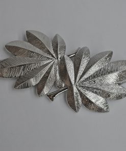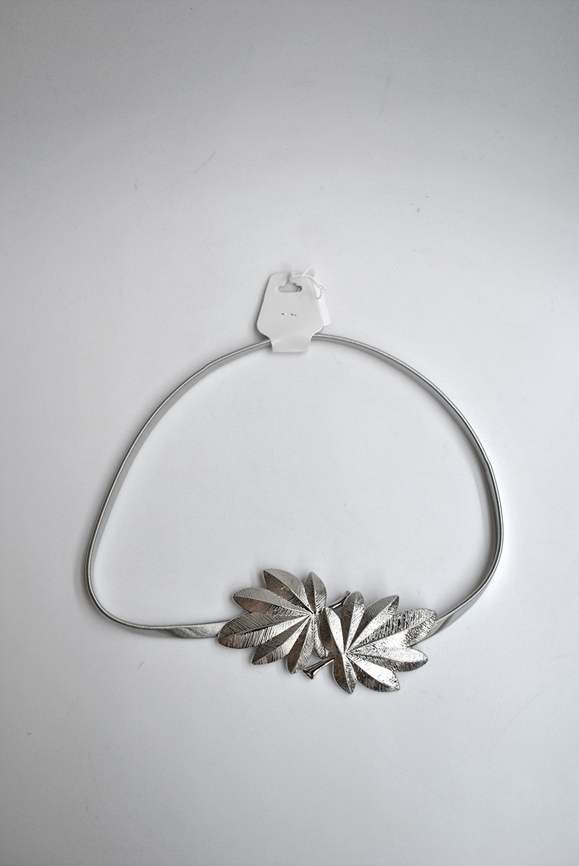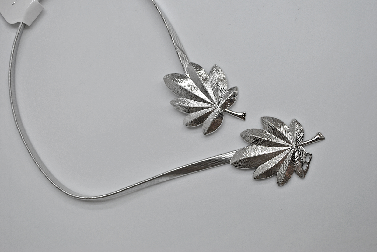 R03/5083 – Elegante cinturón de fiesta o fajín elástico plateado. Se trata de un cinturón con detalle de dos hojas en la hebilla central.