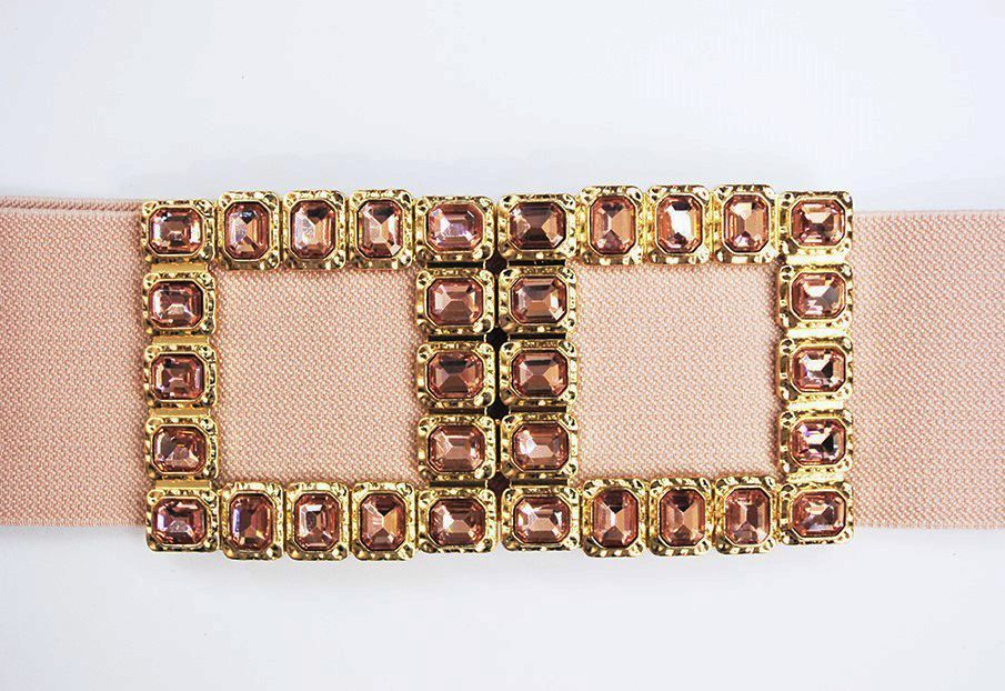 R21/3873 -Precioso cinturón de fiesta elástico o fajín ideal para vestido. Presenta la goma en color rosa nude y destacan dos cuadrados con metal dorado y decorados con cristales también de color rosa