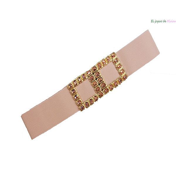 Precioso cinturón de fiesta elástico o fajín ideal para vestido. Presenta la goma en color rosa nude y destacan dos cuadrados con metal dorado y decorados con cristales también de color rosa