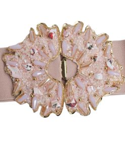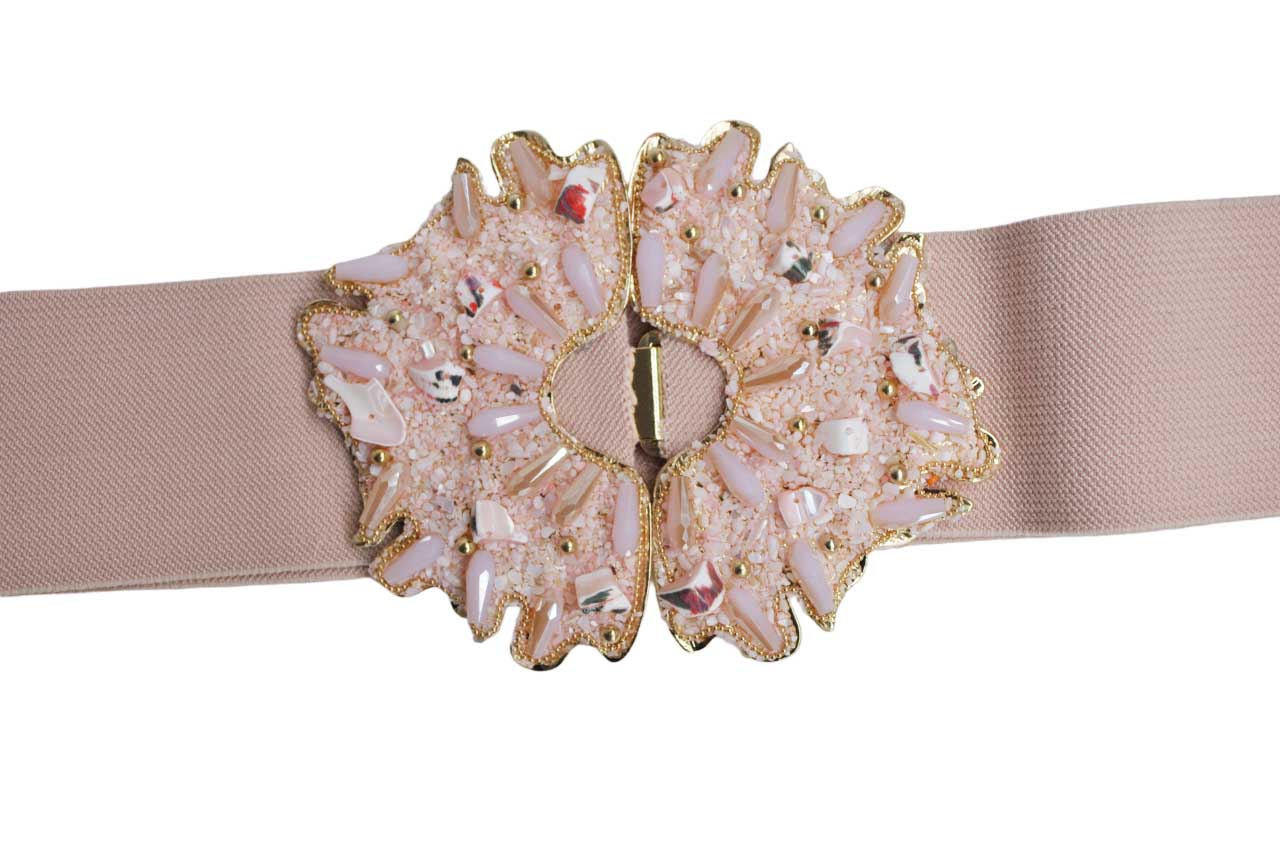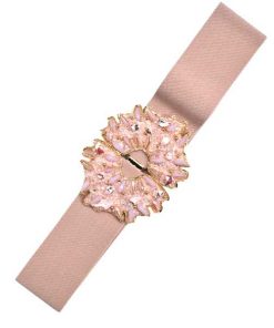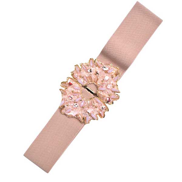 R04/5653 – Bonito fajin o cinturón ancho de fiesta, ideal para colocarlo en vestidos. Se trata de un cinturón elástico con goma en color rosa y presenta la decoración central de un medallón decorado con piedras y perlas rosadas nacaradas.