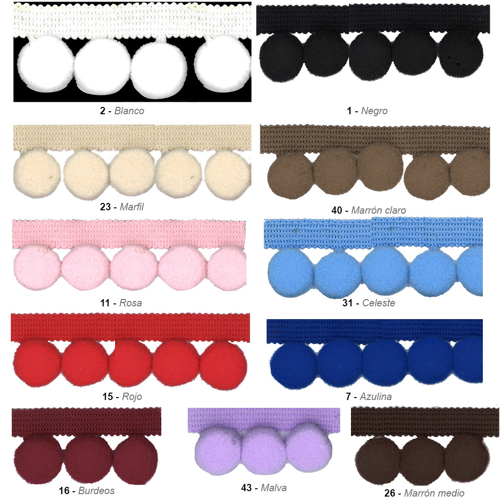 | Color | 1 / NEGRO, 11 / ROSA, 15 / ROJO, 16 / BURDEOS, 2 / BLANCO, 23 / MARFIL, 26 / MARRON MEDIO, 31 / AZUL CELESTE, 40 / MARRON CLARO, 43 / MALVA, 7 / AZULINA |