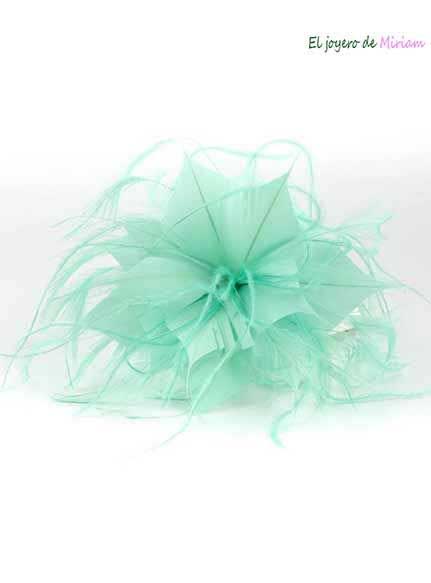 R21/4106 -Tocado bodas en color VERDE AGUA, sencillo y elegante a la vez, con el diseño en forma de flor con los pétalos abiertos decorados con finas y delicadas plumitas vaporosas dando originalidad y movimiento a este precioso accesorio para su vestido de fiesta o noche. Además, lleva una pinza e imperdible para que pueda ponerlo tanto en el cabello como en una prenda de vestir a modo de broche.