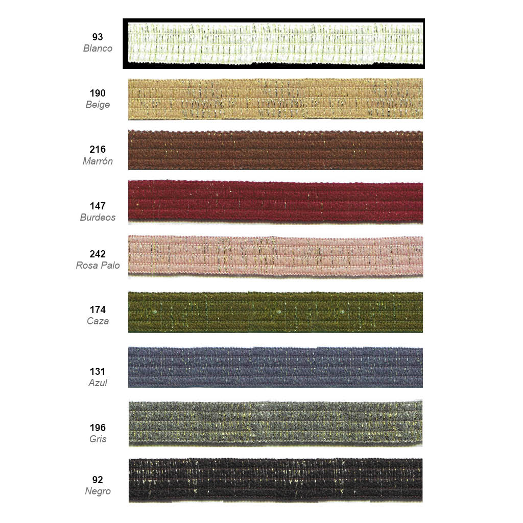 Galón pasamanería con ribete y lurex que le aporta un brillo especial.