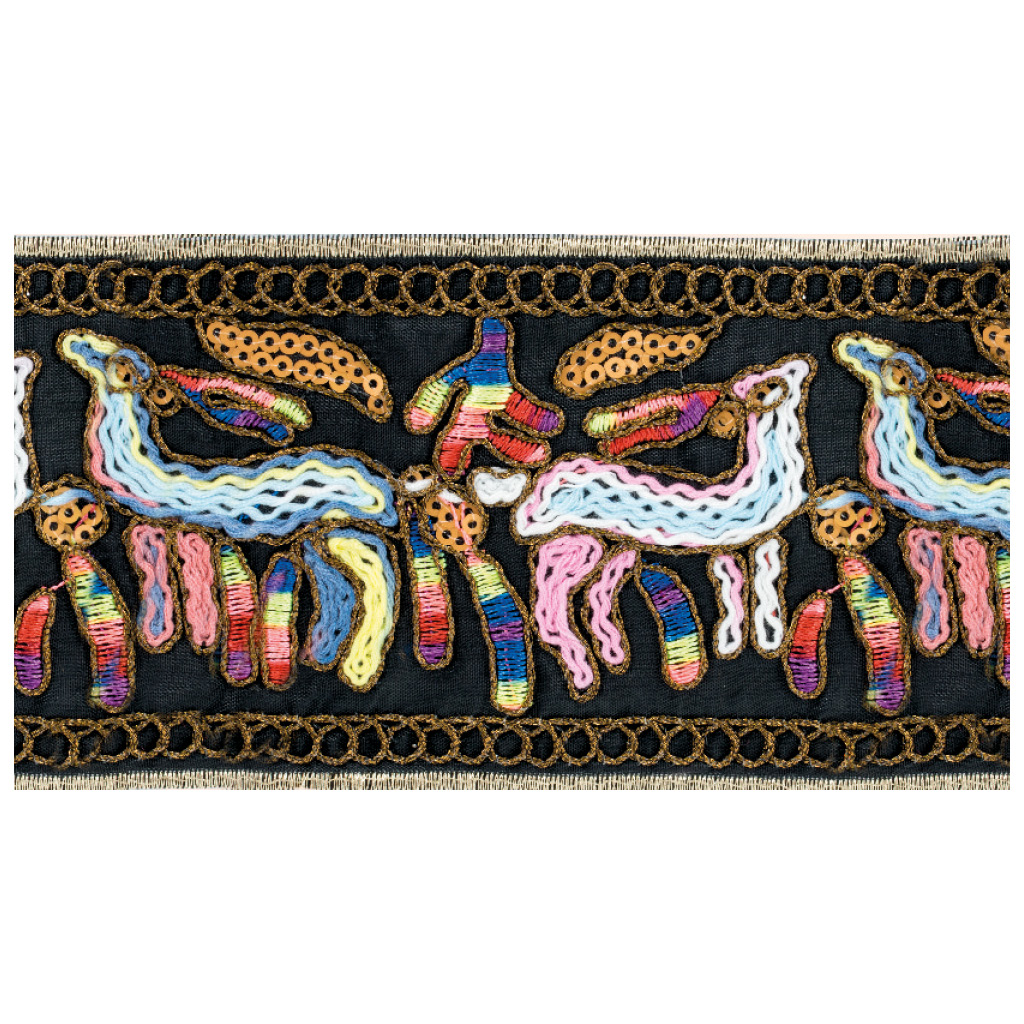 Galón bordado con hilos multicolor formando una cenefa de animales.