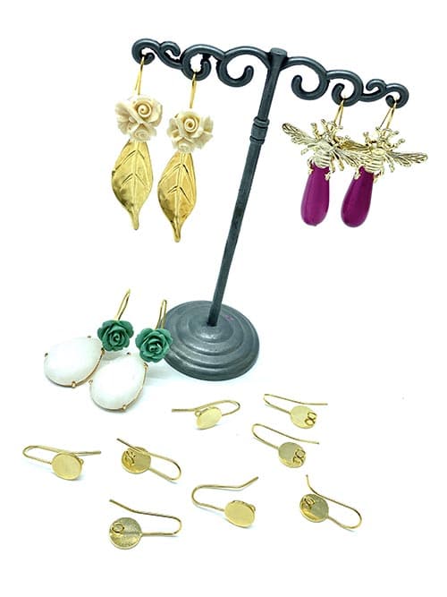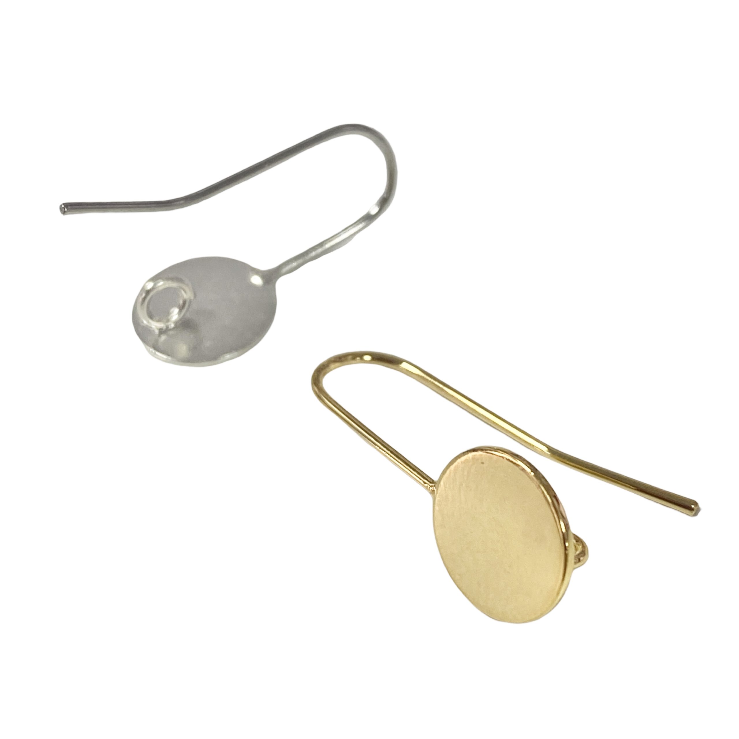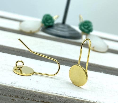 Gancho para pendiente fabricado en latón y chapado en oro o plata con base redonda y anilla en la parte trasera para colgar.