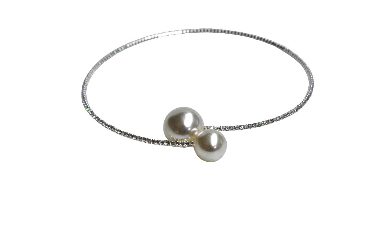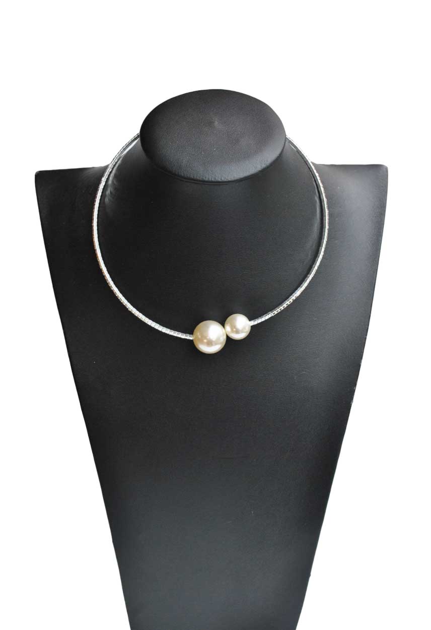 R04/5506 – Bonita gargantilla fabricada en bisutería plateada y decorada con pequeños brillantes blancos y dos perlas nacaradas.