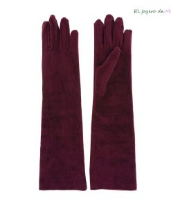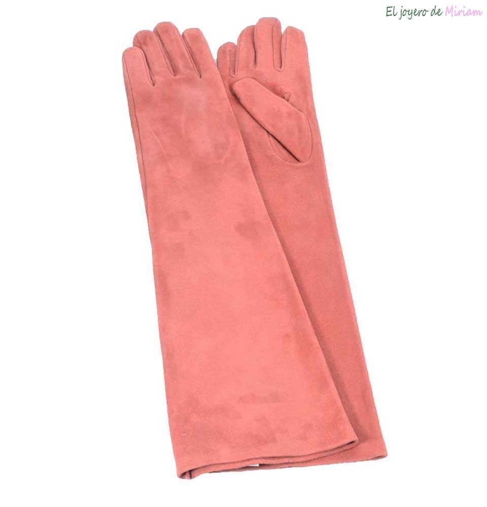 Preciosos guantes e fiesta, de unos 40cm desde la punta de los dedos hasta la parte final del guante. Están fabricados en antelina de color coral, con un tacto muy agradable.