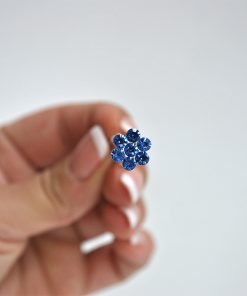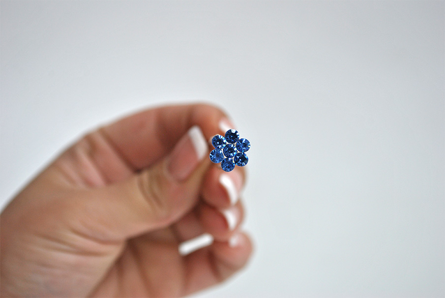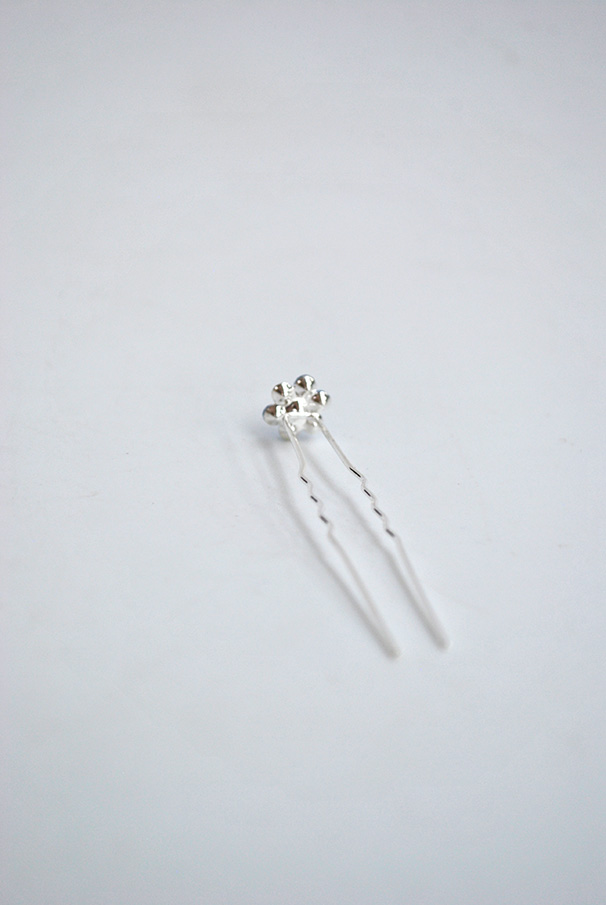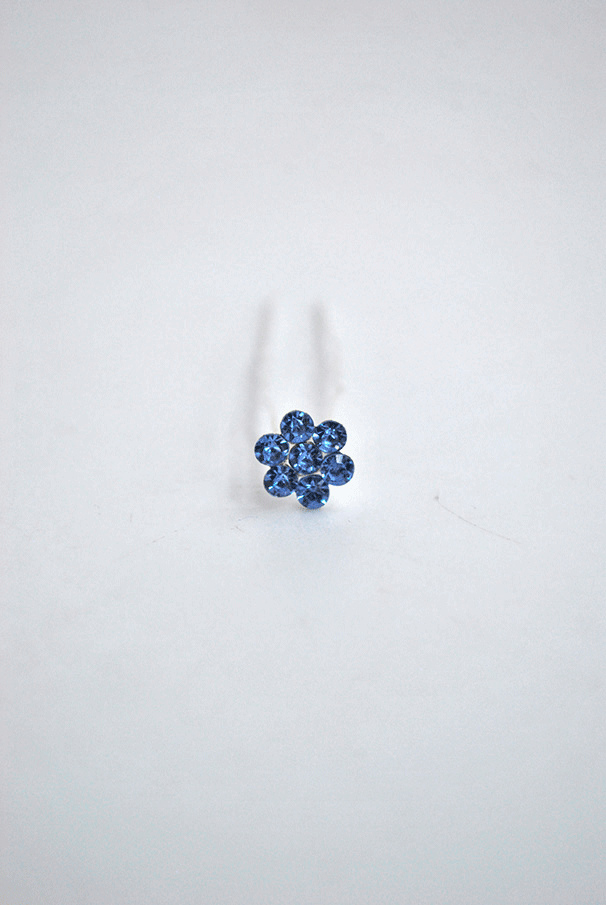 R03/HREF – Horquilla de fiesta fabricada en metal ligero plateado y decorada con una flor con pequeños cristales azules.