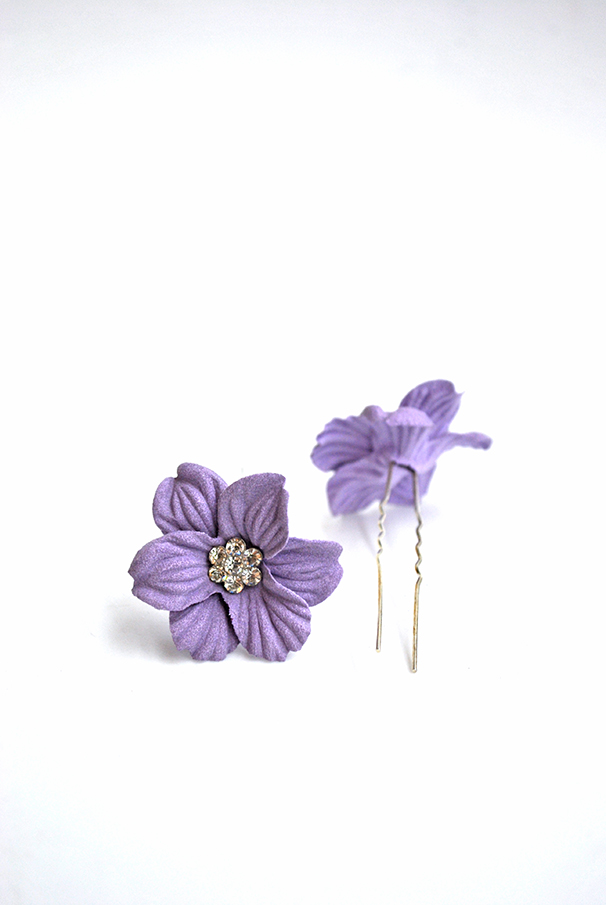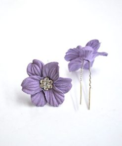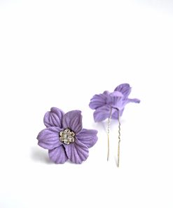 R03/H0110 – Preciosa pareja de horquillas lilas de fiesta. Se tratan de dos horquillas ideales para colocarlas en recogidos o semirecogidos. Presentan florecitas con brillantes blancos.