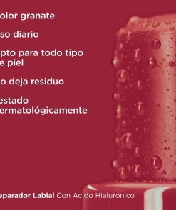 ISDIN Reparador Labial Stick GRANATE 4g es un bálsamo labial dermocosmético desarrollado para brindar hidratación profunda, protección contra agresiones externas y un toque de color suave para realzar la belleza natural de tus labios. Su fórmula avanzada contiene ácido hialurónico, un potente agente hidratante que ayuda a retener la humedad y regenerar la piel dañada de los labios, aliviando inmediatamente la sequedad, tirantez o irritación.
