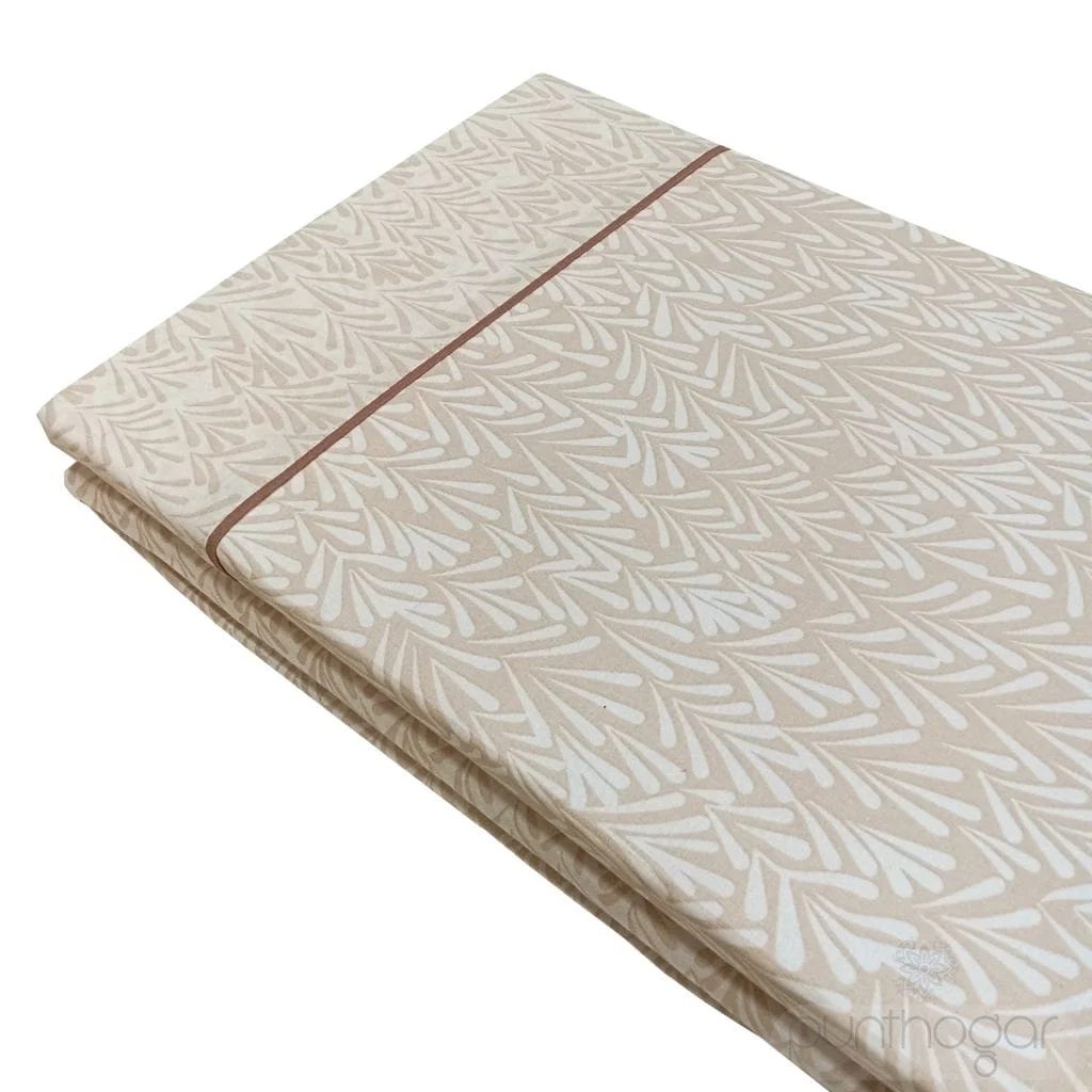 – Diseño Atemporal: estampado discreto de hojas en tonalidades neutras, con línea decorativa en la funda de almohada.