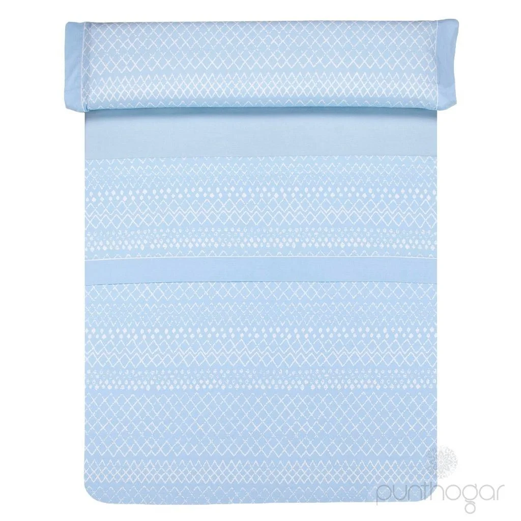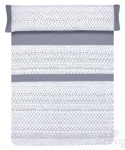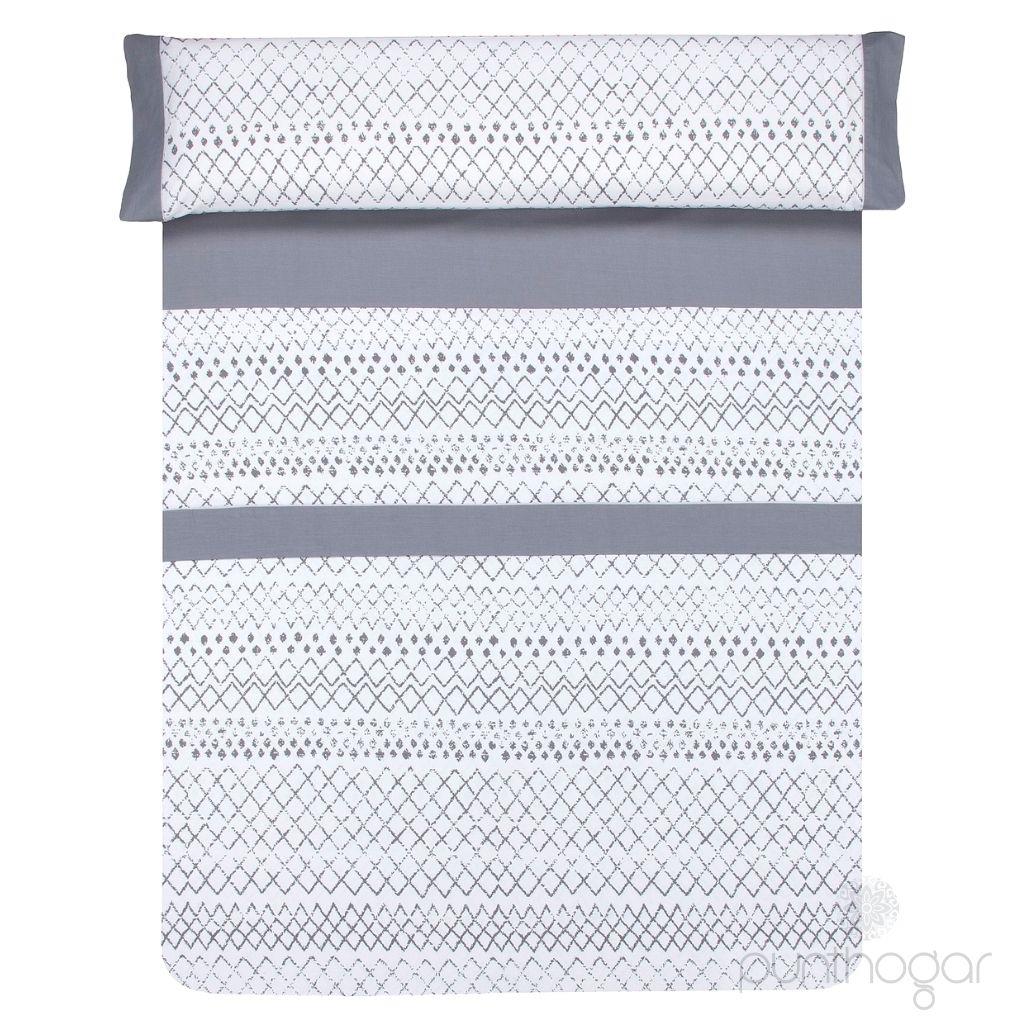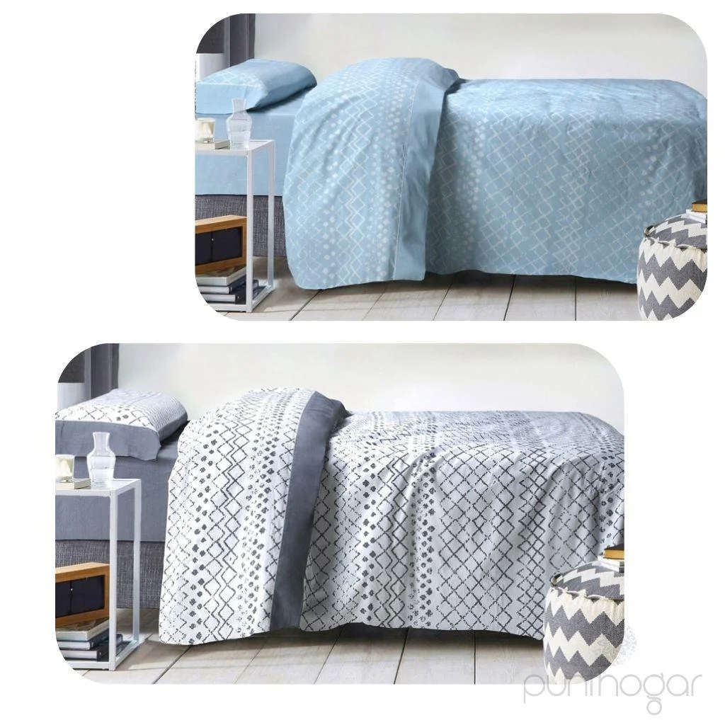 - Sábana encimera: la sábana encimera complementa el juego con un diseño elegante y suave al tacto. Proporciona una capa adicional de confort al dormir. Presenta un estampado geométrico moderno y elegante en tonos de azul y gris, dependiendo del modelo elegido. Es más decorativa y visible, diseñada para dar un toque elegante cuando la cama está hecha.