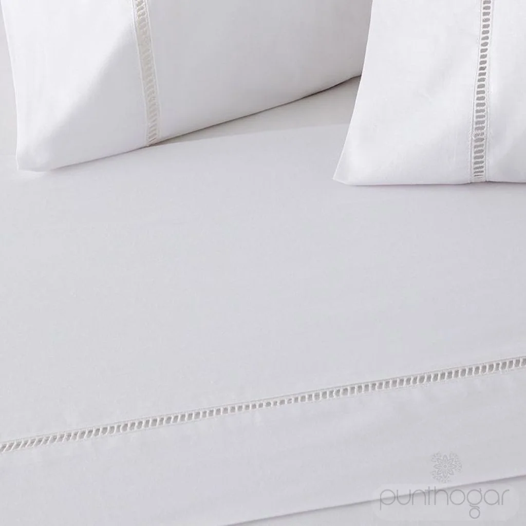 El pack de 4 piezas está compuesto por encimera terminada la vuelta con vainica, bajera lisa en color blanco y 2 fundas de almohada en formato petaca también con vainica.