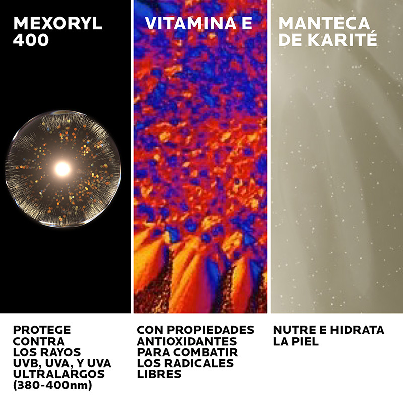 - Protección solar muy alta: Gracias a su fórmula con Mexoryl 400, uno de los filtros UV más potentes del mercado, este protector solar brinda una protección óptima contra los rayos UVA, incluso los más largos, que penetran profundamente en la piel.