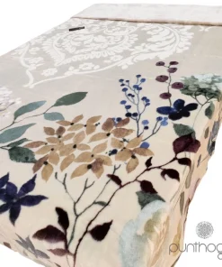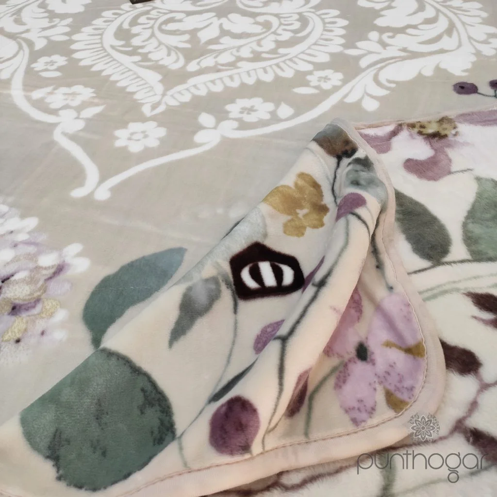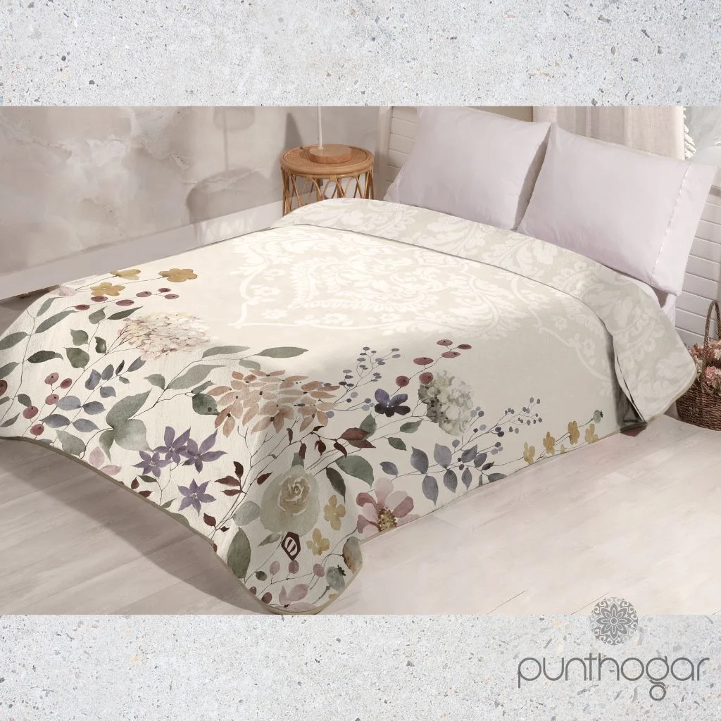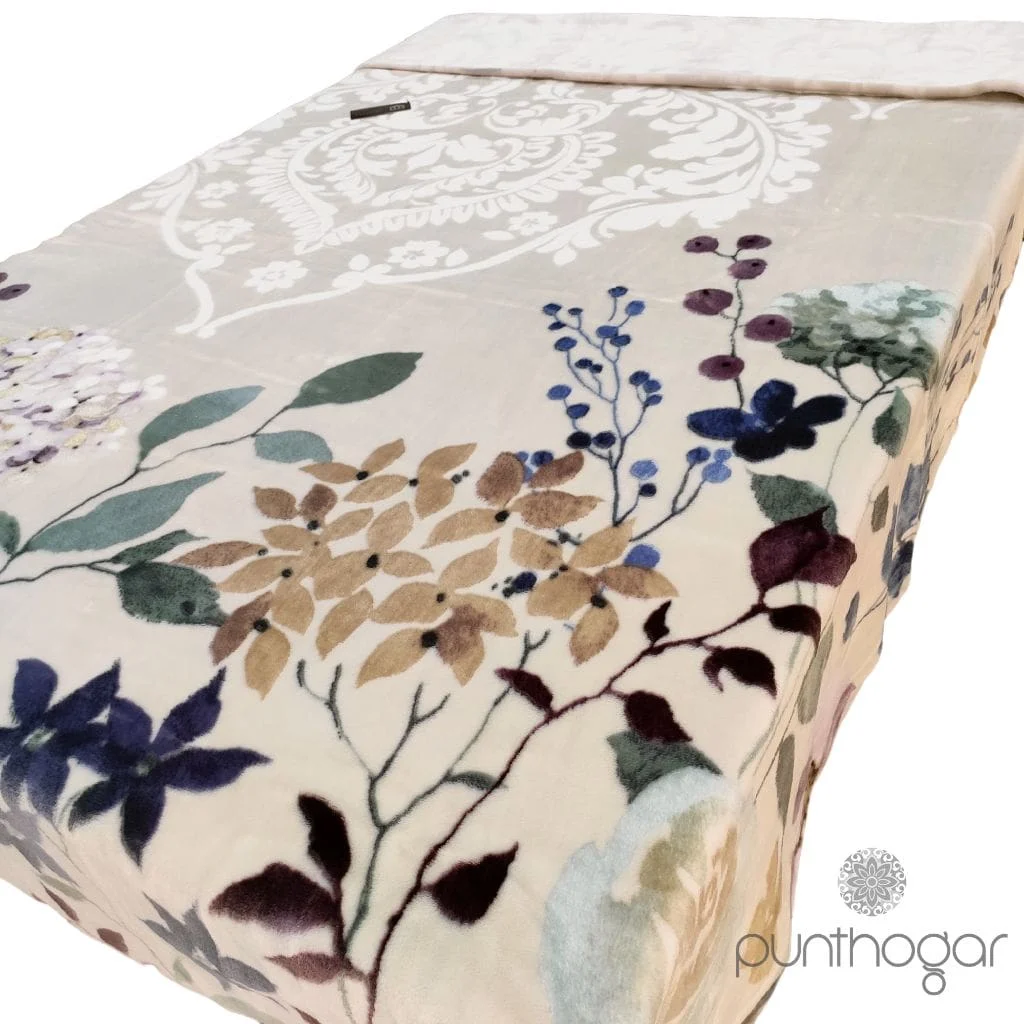 Manta cama VIP 580 con diseño y colorido elegante tipo floral de la firma Manterol. Una manta en terciopelo con un tacto impresionante en color beis que le aportará un abrigo único en la estación invernal.