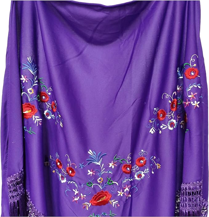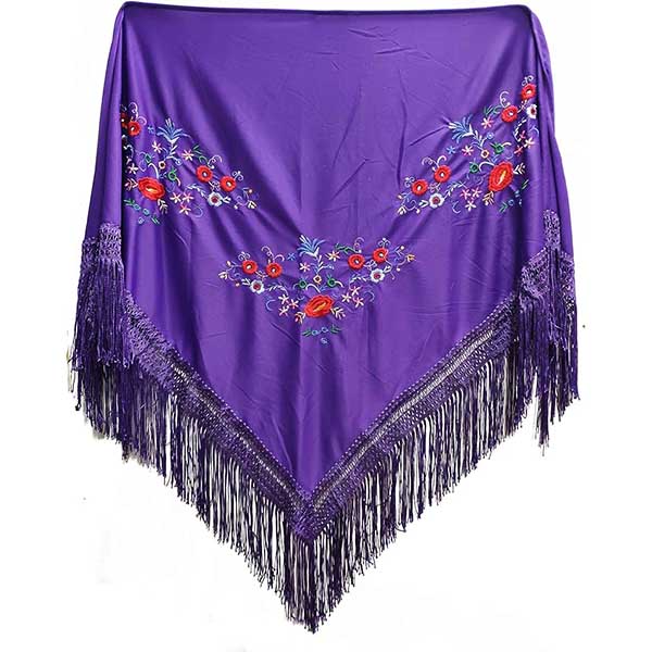Bonito y original mantoncillo para flamencas. Se trata de un mantoncillo morado fabricado en polyester y bordado con flores y con acabado en pico.