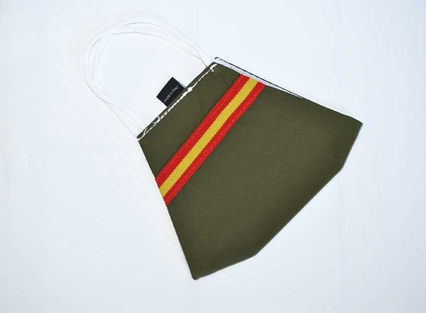 Mascarilla higiénica de algodón en color verde kaki con motivo impreso de la bandera de España y, que se adapta fácilmente a la cara mediante bandas elásticas, cubriendo la nariz, la boca, y el mentón en su totalidad. La alta calidad de los materiales ofrece comodidad.