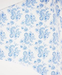 Mascarilla blanca con tela decorada con motivos florales en tono azul cielo fabricada con doble tejido lavable y reutilizable.