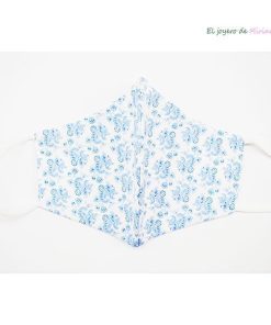 Mascarilla blanca con tela decorada con motivos florales en tono azul cielo fabricada con doble tejido lavable y reutilizable.