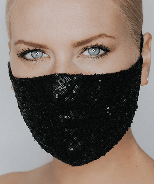 Mascarilla de lentejuelas negras fabricada con doble tejido lavables y reutilizables.
