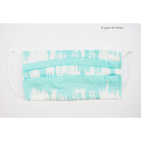 REF: 3518 – Mascarilla tie dye azul y blanca con filtro incorporado. Confeccionada con capa exterior en 100% algodón, filtro TNT 100% polipropileno, capa interna 100% algodón y varilla flexible para que se adapte perfectamente a la nariz.