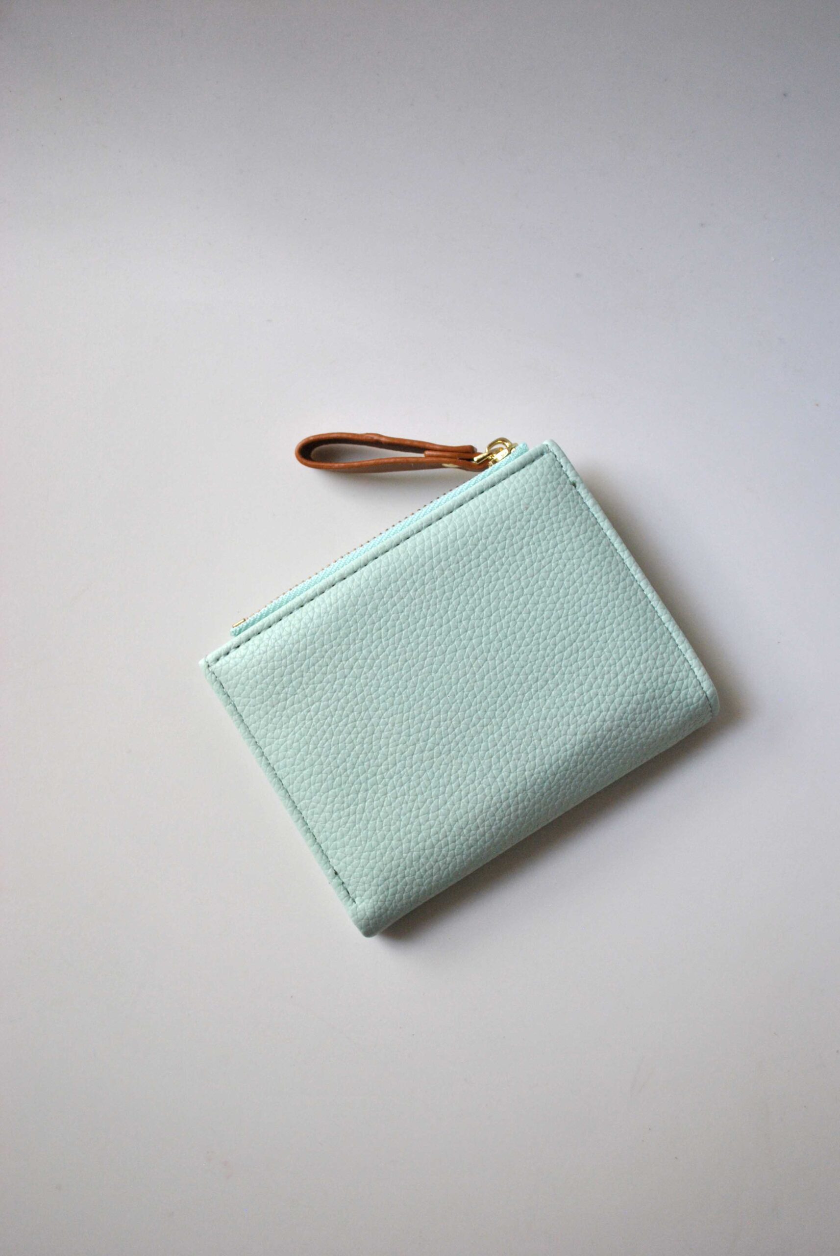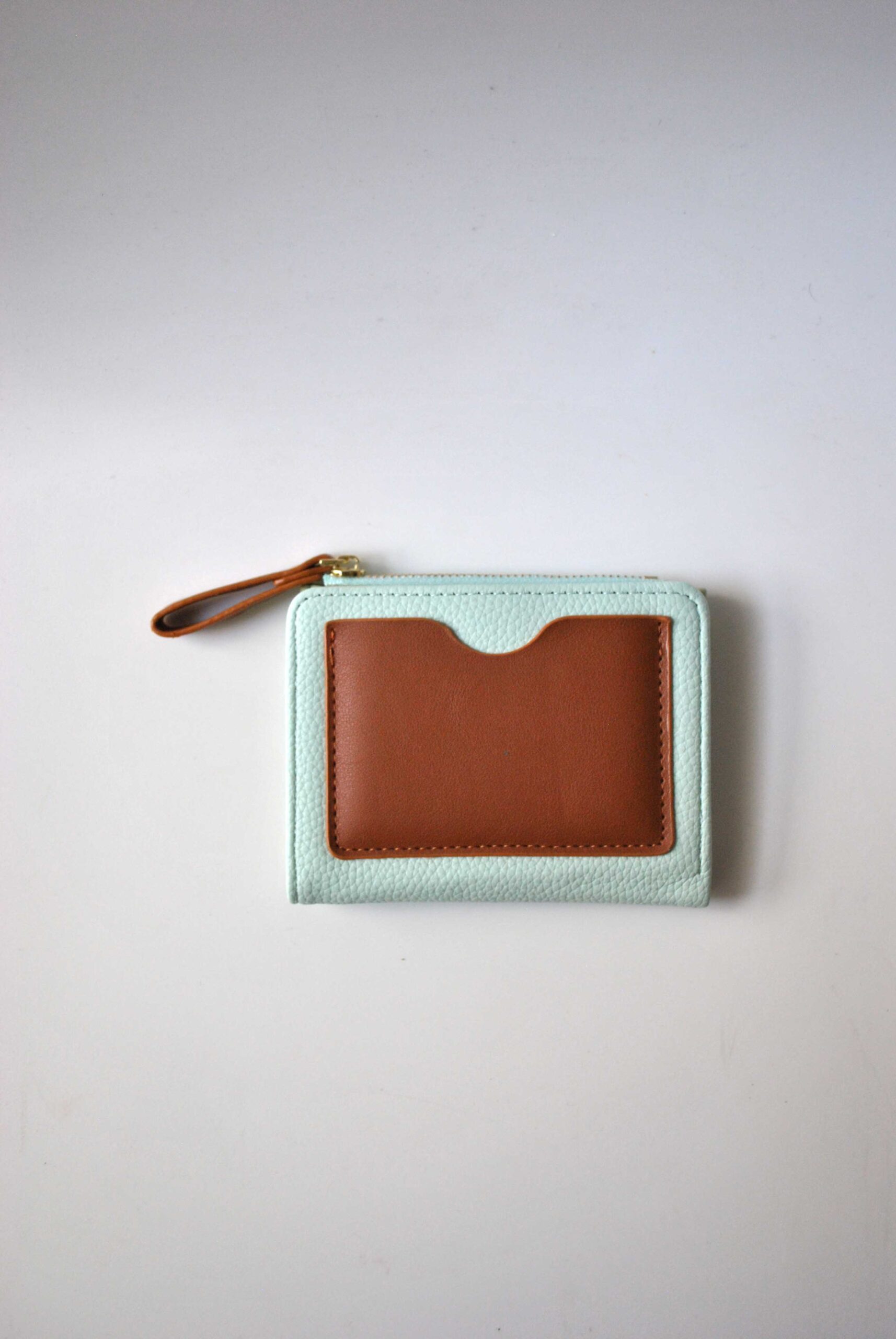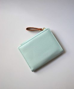 REF: DV203718 – Este elegante monedero combina funcionalidad y estilo con su diseño en tonos verde agua y marrón. Confeccionado en piel sintética texturizada, ofrece un tacto suave y resistente al uso diario. Su exterior incluye un práctico bolsillo plano y un tirador de cremallera en tono marrón con herrajes dorados.