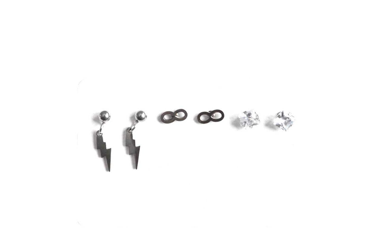 R04/5544 – Pack de 3 pares de pendientes pequeños plateados para los agujeros de la oreja. Tienen forma de diamante, de rayo y del símbolo del infinito. Están fabricados en acero inoxidable plateado y constan de cierre a presión.