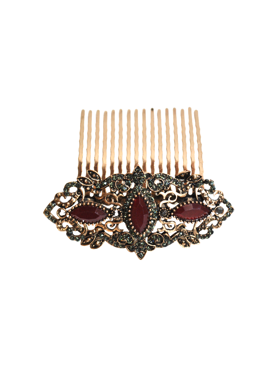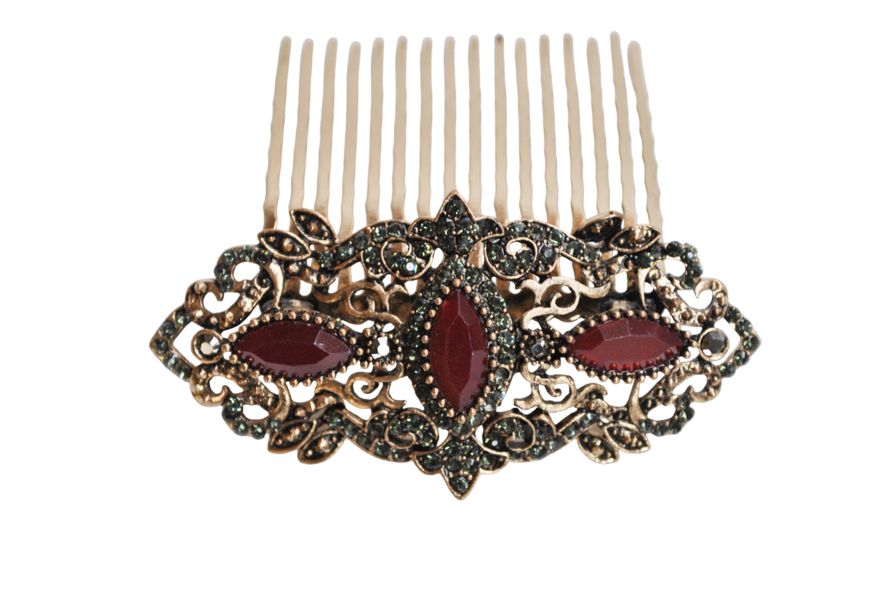 R04/5734 – Preciosa y elegante peineta de fiesta o tocado para pelo estilo antiguo. Se trata de una peineta fabricada en metal ligero dorado envejecido. Presenta cristales facetados de color granate burdeos además, de, elegantes cristales enejecidos. Perfecta para cualquier recogido en aquellas bodas y eventos especiales.