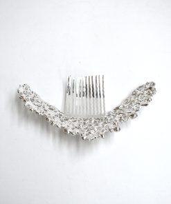 R03/5053 – Original tocado o peineta plateada de fiesta fabricada en metal ligero plateado y decorado con elegantes cristales blancos formando hojas. Ideal para recogidos y semirecogidos y que luzcas como la novia o invitada perfecta.