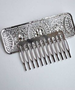R03/5025 – Preciosa peineta de fiesta o tocado plateado. Se trata de una peineta decorada motivos florales y vegetales en metal ligero plateado. Ideal para completar tu look de invitada.