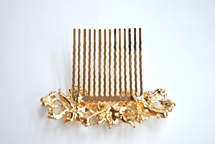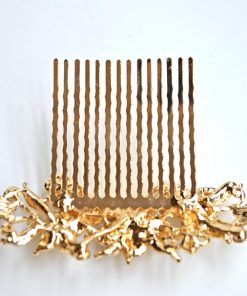 R03/5328 – Elegante peineta de fiesta dorada, ideal para recogidos y semirecogidos. Se trata de una peineta fabricada en metal ligero dorado y está decorada con pequeñas flores y cristales dorados.
