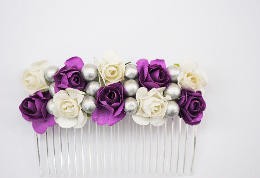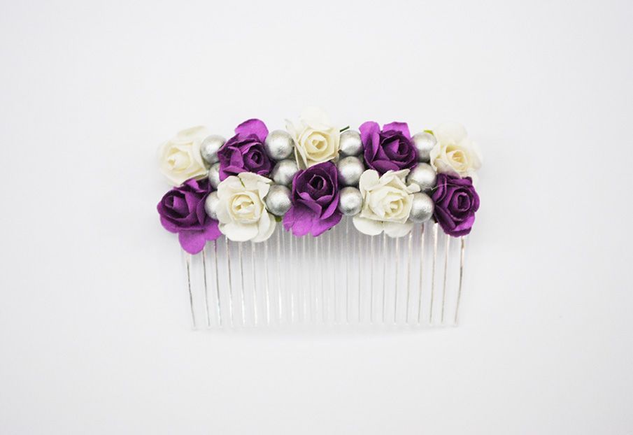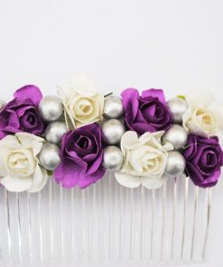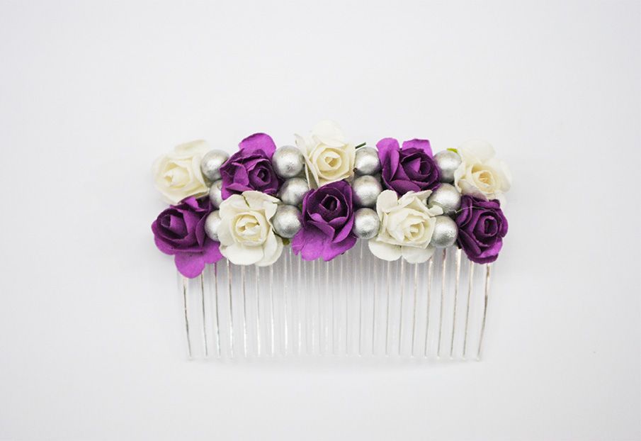 Maravillosa peineta de fiesta o tocado de flores. Se trata de una peineta de hecha a mano. Se ha confeccionado a base de pequeñas flores combinadas en tono blanco y tono morado. Además destacan pequeñas bolitas plateadas.