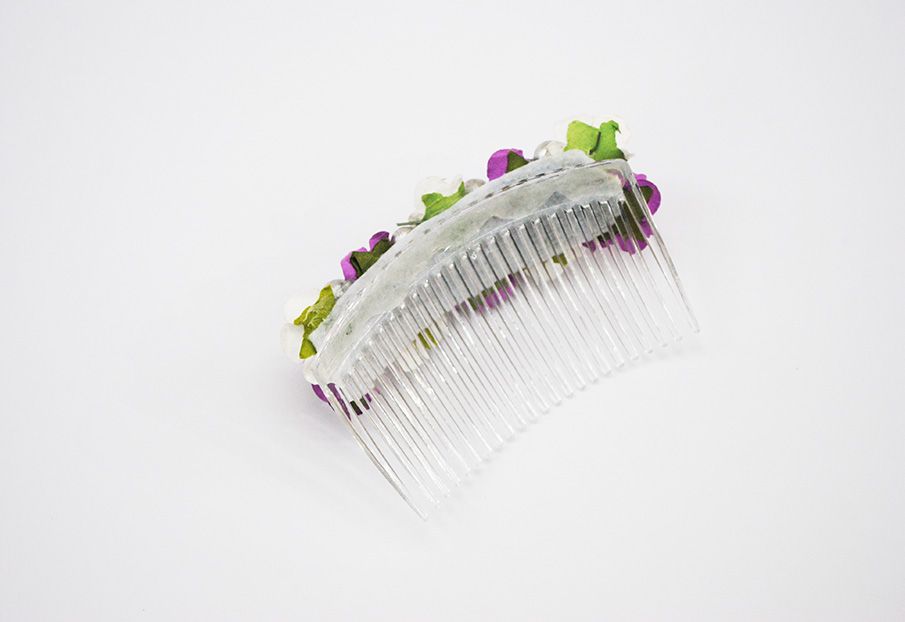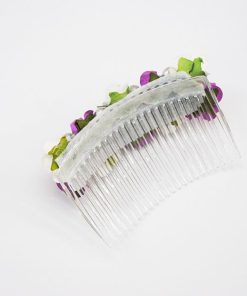 R21/4000 – Maravillosa peineta de fiesta o tocado de flores. Se trata de una peineta de hecha a mano. Se ha confeccionado a base de pequeñas flores combinadas en tono blanco y tono morado. Además destacan pequeñas bolitas plateadas.