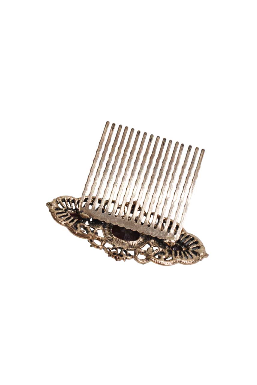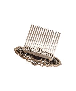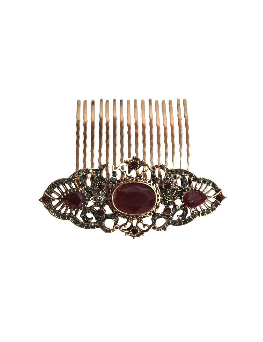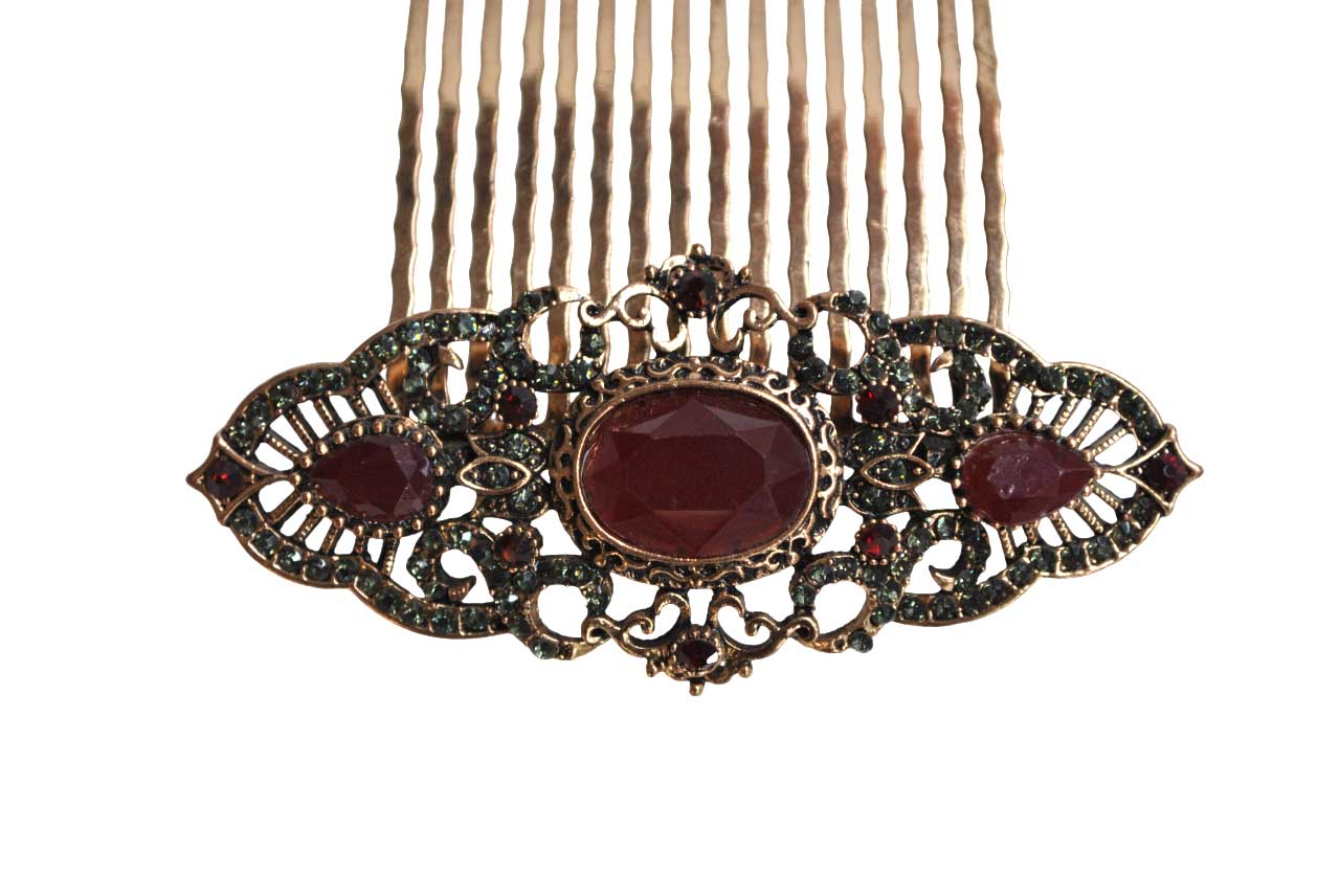 R03/4597 – Bonita peineta de fiesta envejecida. Se trata de una peineta estilo antiguo decorada con pequeños cristales blancos envejecidos y piedras burdeos facetadas.