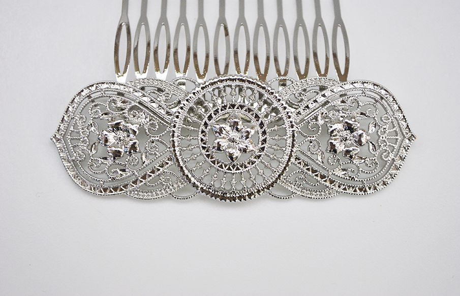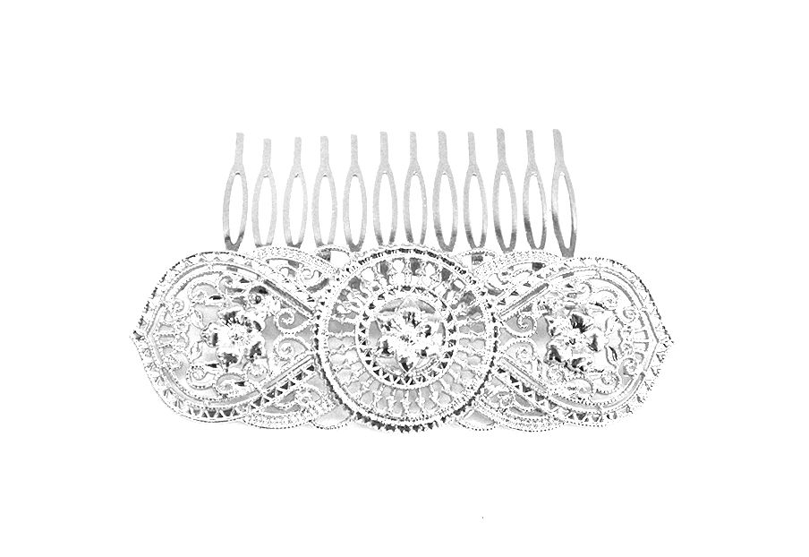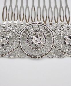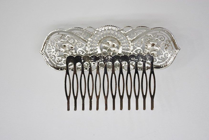 R02/4451 – Preciosa peineta de fiesta o tocado plateado. Se trata de una peineta decorada motivos florales y vegetales en metal ligero plateado. Ideal para completar tu look de invitada.