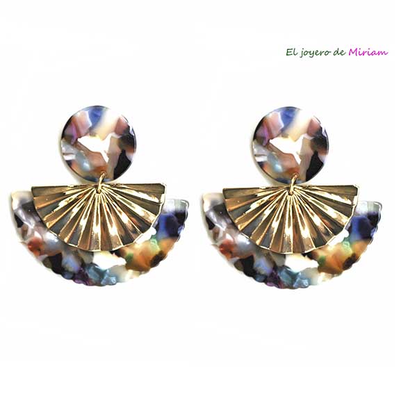 R03/5078 – Bonitos y originales pendientes de mujer. Se tratan de unos pendientes montados sobre bisutería dorada y decorados con aplicaciones de acetato multicolor. Constan de cierre a presión.