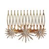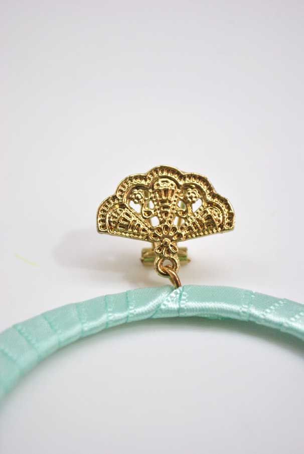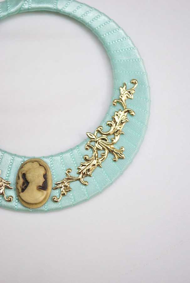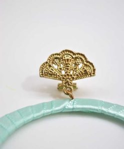 R02/4651 – Preciosos pendientes aguamarina de flamenca. Se tratan de unos pendientes diseñados en forma redonda y forrados con tela brillante aguamarina. Están montados sobre bisutería dorada y presentan decoraciones doradas vegetales y camafeos. Cierre omega.