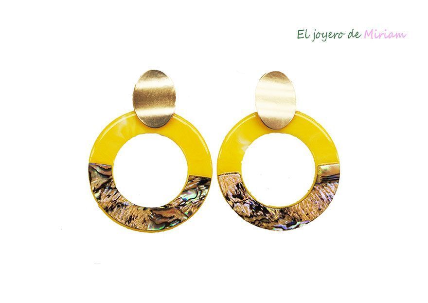 Preciosos pendientes amarillos diseñados en forma de círculo. Presentan una aplicación dorada y un aro acrílico amarillo combinada con carey.
