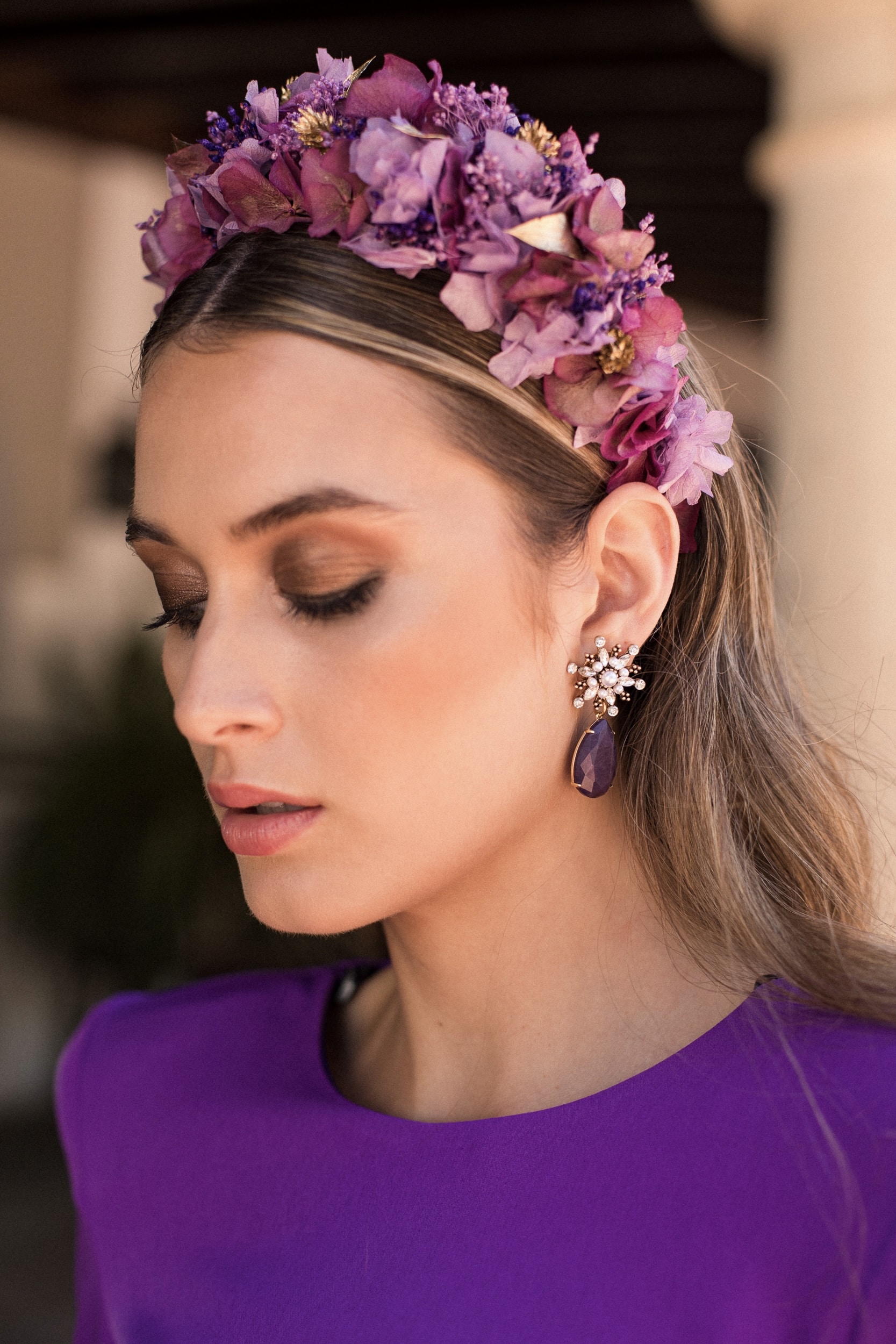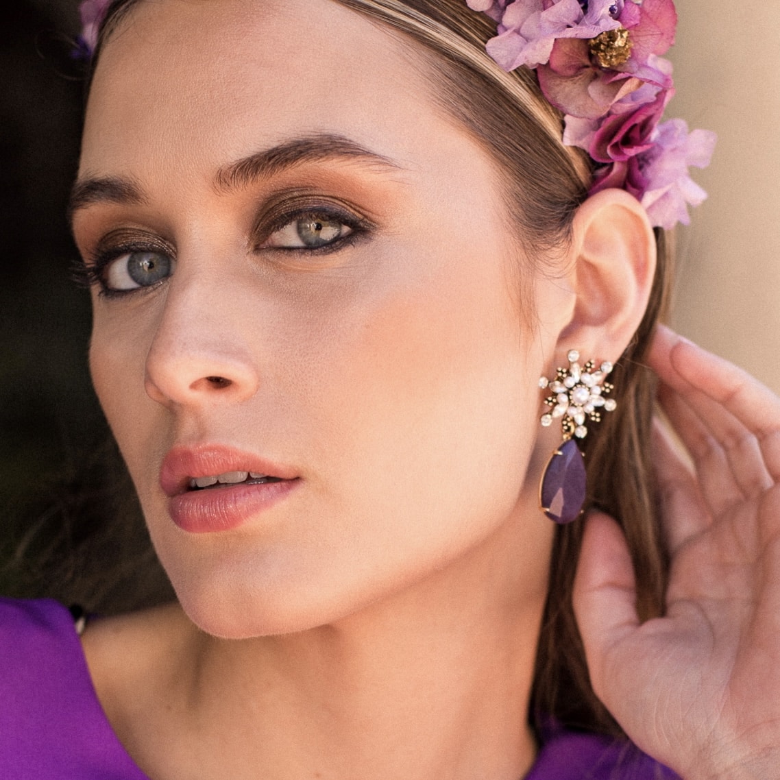 Pendientes elaborados en nuestro taller con estrellas de perlas y lagrimas morados de jade.