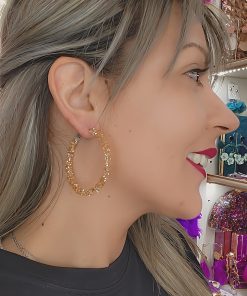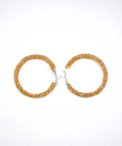 R02/4836 – Originales y elegantes pendientes de fiesta. Se tratan de unos pendientes diseñados en aro, forrados con pequeñas cuentas pegadas brillantes en color dorado-champagne. Presentan el metal del broche en dorado.